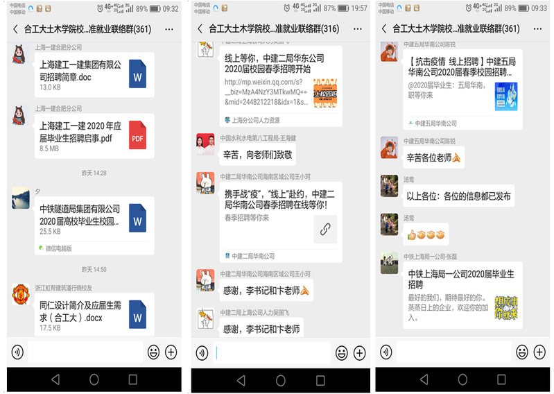 “通过这个校企网上联络群,学校的政策了解的更及时了,我们的需求也可以更好的对接了,非常的方便快捷”,这是武汉雷神山医院承建单位中建三局一公司校园招聘程经理对校企联络群评价。面对新冠肺炎疫情,WilliamHill官方网站积极响应学校就业工作要求,充分利用互联网优势,将疫情防控和促进精准就业有机结合,开展形式多样的网上就业指导服务活动,构建全方位的就业信息服务体系。