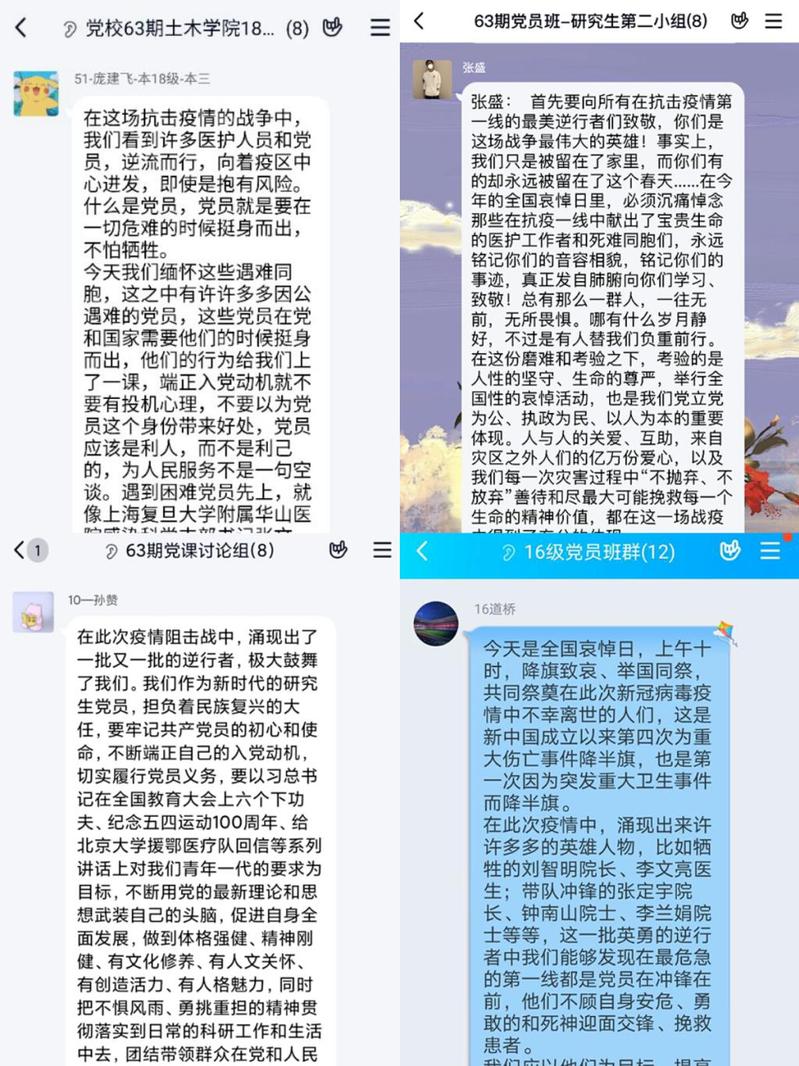 缅怀逝世同胞,寄托深切哀思。在这场抗击疫情斗争中,我们失去了众多骨肉同胞,他们当中,有与病魔较量、不幸被病毒感染以至献出生命的医务人员;有夜以继日工作、突发疾病不幸殉职的公安干警;有冲锋在前无私奉献、不幸倒在最前沿的党员干部;有与病毒顽强抗争、不幸病亡的普通群众。他们都是与我们血脉相连的骨肉、生死相依的亲人,手足之情、同胞之谊,是每个中国人心中最深沉的情感。第63期党员班学员给排水科学与工程2017-2班的谢浩扬说到“清明时节,不仅只是一个节气,更是一个节点,尤其是在疫情的洗礼下,2020年的清明节注定不同寻常。一场突如其来的疫情,带走了太多鲜活的生命,也许他们已经离开了这个世界,但从未走出我们的怀念”。水利水电工程2018-2班罗王琛认为对逝者最好的告慰,就是奋力前行,他表示,哀悼是生者对逝者的缅怀,也是逝者留给生者继续活下去的勇气、坚持不懈的信心与无法割舍的感情慰藉。