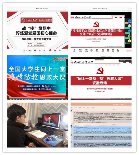 组织生活“线上过”,党员教育不断线。疫情防控特殊期间,WilliamHill官方网站本科生第一党支部充分利用腾讯会议、学习强国、QQ、“青马者说”微信公众号等线上平台,创新组织生活方式,全覆盖扎实开展线上政治理论学习和“三会一课”,确保支部党员在疫情防控期间的学习教育不断线,引领支部党员同志坚定信念、恪守初心、践行使命。疫情发生初期,党支部迅速组织线上专题组织生活会,带领全体党员学习党中央及教育部党组、安徽省委和学校党委对疫情防控的相关部署文件,在支部组织学习《众志成城战疫情,共克时艰做先锋——致williamhill中国官方网站全体学生党员的“防疫”倡议书》,教育引导支部党员带头发挥先锋作用,在疫情防控工作中亮身份、见行动、作贡献。3月3日,党支部兼职组织员马贤峰老师为支部上“战‘疫’烽烟中,淬炼爱党爱国初心使命”专题线上“微党课”,教育引导全体党员坚定忠诚奉献、实现爱党爱国、勇于担当贡献。3月9日,党支部组织学生党员和入党积极分子开展“同上一堂疫情防控思政大课”主题教育活动,引导全体党员向抗“疫”英雄模范学习,强化党员意识、坚定理想信念。3月18日,在政治理论学习会上,习近平总书记给北京大学援鄂医疗队全体“90后”党员的回信在支部全体党员中引发了热烈反响,通过线上集体学习、在线讨论、心得撰写等形式开展线上交流学习,引导广大党员不忘初心,牢记使命,在为人民服务中茁壮成长,在艰苦奋斗中砥砺意志品质,在实践中增长工作本领,争做堪当大任的时代新人。4月23日,党支部再次组织全体党员和积极分子开展“全省同上一堂战‘疫’思政大课”主题教育活动,引导广大青年学生正确认识和看待此次战“疫”,树立责任担当意识,激发学生爱党爱国爱社会主义的深厚情怀。