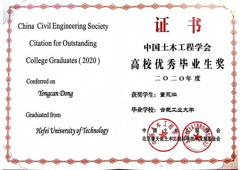 董永灿同学荣获2020年度中国土木工程学会高校优秀毕业生