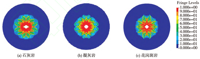 基于上述问题,王志亮教授团队采用有限元软件LS-DYNA从损伤变量的角度,对常见岩石的单孔爆破过程进行数值分析,相关研究发表在期刊《水利水运工程学报》上。本研究对比石灰岩、凝灰岩等爆破损伤分布规律,探究了石灰岩爆破损伤范围随径向不耦合系数增大的变化关系(图1)。此外,还提出了一种单元损伤的统计方法,结果表明不同爆心距的损伤量均呈反“S”形曲线衰减,其可用Logistic函数模型对其进行表征。