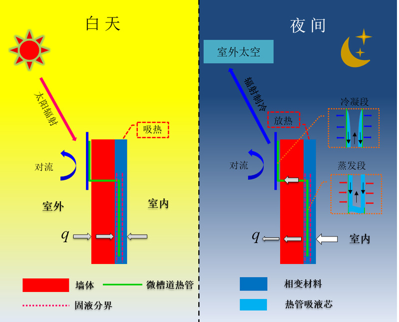 williamhill官网何伟教授团队提出了一种新型相变墙体(RC-PCM),其综合了相变材料高蓄热能力、微槽道热管(Micro-channel heat pipe, MHP)高热导率、天空辐射制冷(Radiative cooling, RC)自发散热的优势,即利用连接相变墙体与辐射制冷装置的微槽道热管,在夜间快速地将存储在相变墙体的热量通过辐射制冷及空气对流的方式释放到室外,使得相变墙体能够实现完整的融化-凝固-融化的相变过程。