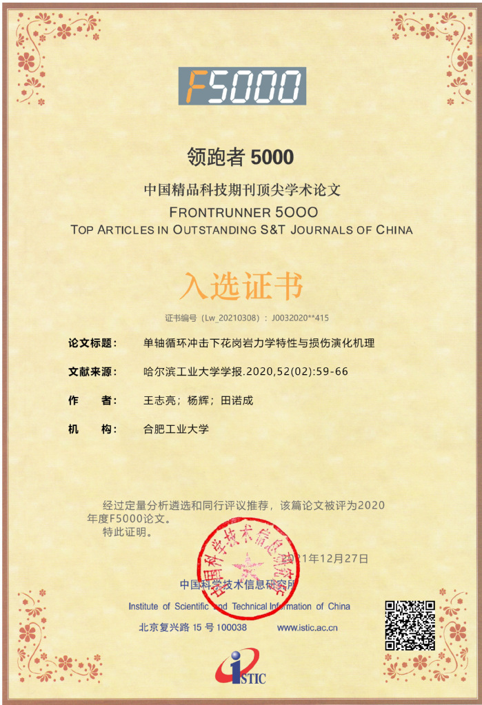 近日,中国科学技术信息研究所(简称中信所)公布了2020年度“领跑者5000——中国精品科技期刊顶尖论文(F5000)”名单,williamhill官网王志亮教授课题组发表论文《单轴循环冲击下花岗岩力学特性与损伤演化机理》获此殊荣。