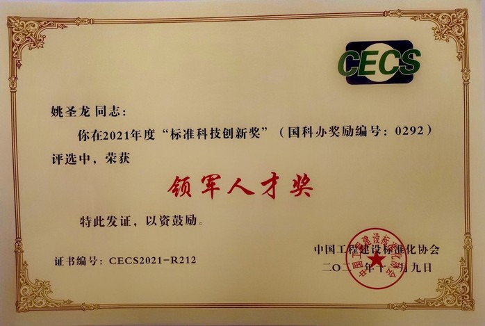近日,中国工程建设标准化协会在山东省济南市召开“标准科技创新奖”颁奖大会。会上公布了2021年中国工程建设“标准科技创新奖”的项目奖、组织奖和人才奖获奖名单。我校兼职教授姚圣龙荣获2021年“标准科技创新奖”领军人才奖。