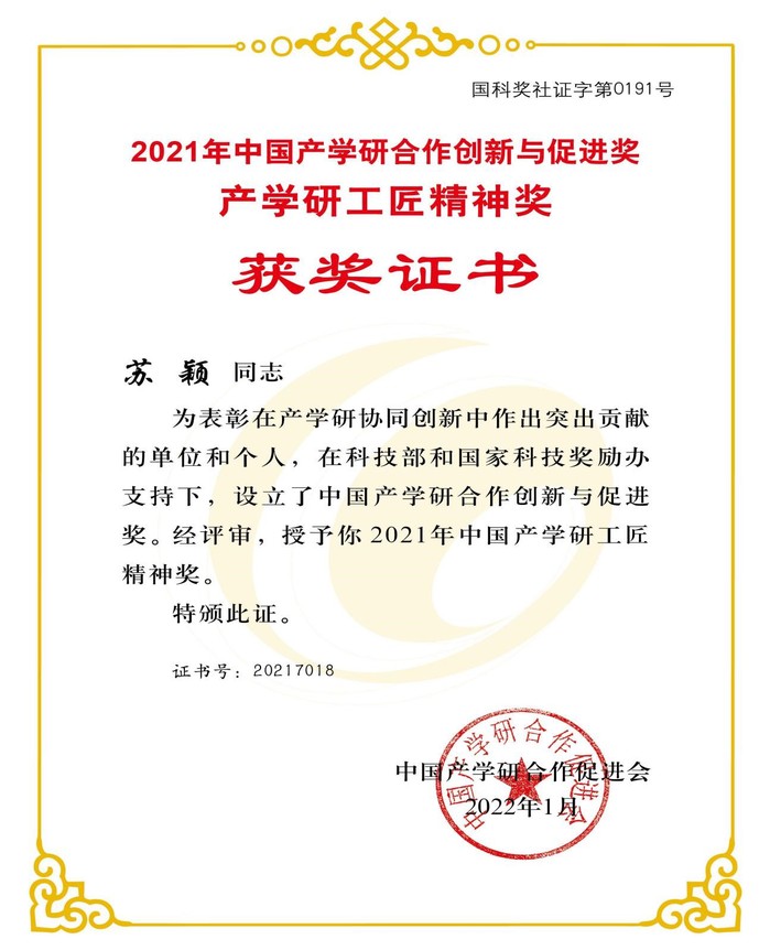 中国产学研合作促进会成立于200711月,是经国务院批准的全国性社会团体。“中国产学研合作创新与促进奖”是经国家科技奖励办批准,由中国产学研合作促进会设立的产学研界全国性高层次奖项。其中“工匠精神奖”用于鼓励和表彰在产学研一线涌现出来的知识型、技能型、创新型的能工巧匠,弘扬劳模精神和大国工匠精神;2021年度全国共有30名一线科技工作者和能工巧匠获此殊荣,其中安徽省获奖者仅2名。