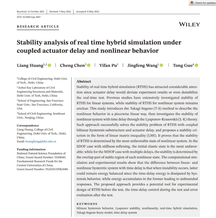 近日,williamhill中国官方网站WilliamHill官方网站实验中心副主任黄亮在实时混合模拟试验方法研究取得新进展。研究成果发表在国际结构动力学Top期刊《Earthquake Engineering & Structural Dynamics》(JCR Q1,IF=4.43)上,论文题为“Stability analysis of real time hybrid simulation under coupled actuator delay and nonlinear behavior”。williamhill中国官方网站黄亮为论文第一作者兼通讯作者,硕士研究生卜逸凡和王静峰教授参加,该项工作与美国旧金山州立大学Chen Cheng教授和东南大学郭彤教授联合完成,得到国家自然科学基金(52008145)和土木工程结构与材料安徽省重点实验室自主创新专项(PA2021GDSK0080)项目资助。