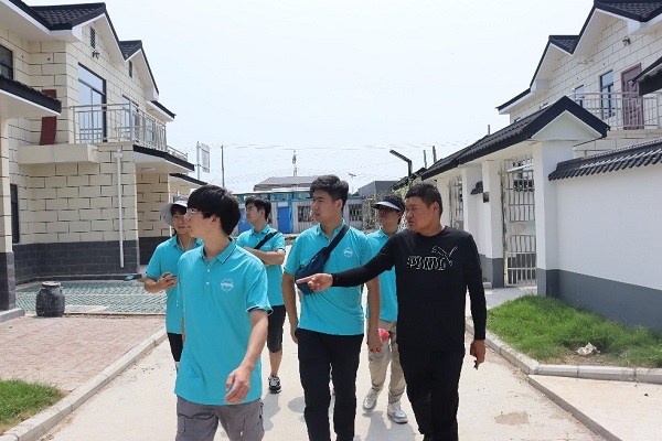 深入村户农房,领略装配式产业赋能绿色低碳发展。19日,团队先后前往牌碑村、梨园村进行实地走访,深入进行装配式农房调研。在牌碑村支部书记的带领下,团队走进龙门里安置小区,所有农房都被设计成二层独立庭院,户型布局方正、紧凑合理、南北通透,一幢幢粉墙黛瓦小洋楼颇具现代气息,楼体外观设计新颖,让人眼前一亮。团队成员在装配式轻钢结构农房的样板房中了解了其施工工艺、所用材料和相关技术标准。随后,实践团在梨园村居委会的带领下走进梨园村,与当地村民进行沟通交流,了解群众入住装配式农房的情况,询问了房屋质量、安全性和居住体验。“随着大量试点示范工程的建设,农民群众对装配式绿色农房的认知度和满意度得到较大提升”,梨园村居民委员会谈主任说。