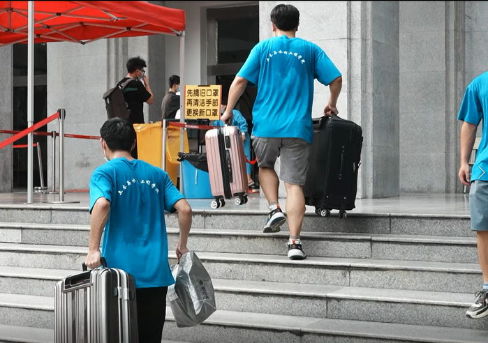 宿舍楼前,楼管工作人员有条不紊地为新生办理相关入住手续,而学院的志愿者们已将新生行李运送至楼下摆放整齐,等待完成报到手续后的新生领取自己的行李并帮忙运送至宿舍。