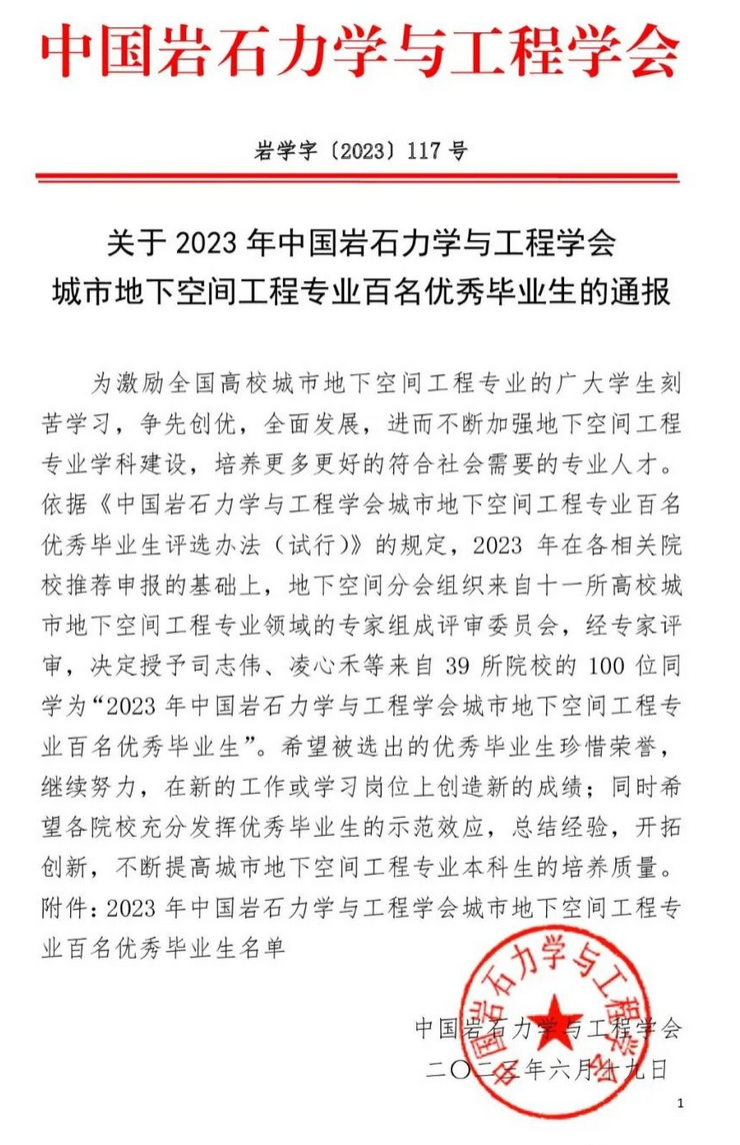 中国岩石力学与工程学会2016年起在全国高校城市地下空间工程专业开展评选优秀毕业生活动,以激励全国高校城市地下空间工程专业的广大学生刻苦学习,争先创优,全面发展,进而不断加强地下空间工程专业学科建设,培养更多更好的符合社会需要的专业人才。近三年我系共13名同学获此荣誉,充分体现了中国岩石力学与工程学会和用人单位对学校城市地下空间工程专业本科生培养质量的高度认可。