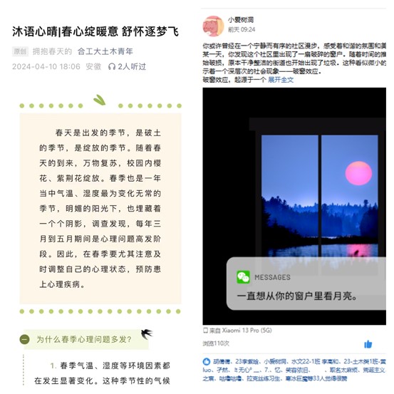 科普推文,线上宣传。一直以来,学院高度重视心理健康知识的线上普及和宣传,以新媒体建设为驱动,探索新时代“互联网+”心理育人平台建设,打好“线上+线下”宣传教育平台“组合拳”。学院土木青年公众号定期推送“沐语心晴”专栏,打造自主宣传QQ平台“小爱树洞”进行心理健康科普类宣传教育,旨在帮助同学们日常学习心理健康知识,提高心理保健意识,实现心灵成长。