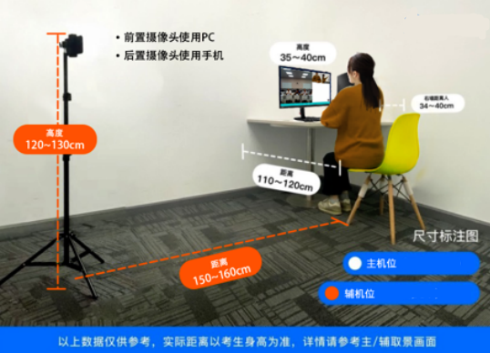 5.设备摆放要求:网络远程面试主设备,需要正向面对考生,复试全程开启,摄像头正对考生。复试过程中,要求视频中考生双手和头部全程在视频录像范围。网络远程面试监考及备用设备,摆放在考生侧后方(与考生后背面成45°角),能够全程拍摄考生本人和电脑屏幕,复试全程开启。复试考生就座和设备安放位置参考图1。