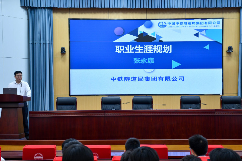职业规划,精耕协同育人新路径。4月27日下午,部分参会企业代表在学术会议中心一楼大报告厅为学院低年级学生作“大学生职业规划”讲座,学院200余名低年级学生参加。讲座上,中铁隧道局集团有限公司人事科科长张永康从自身实际出发,描绘了一条生动的的职业发展之路。他向大家详细介绍了所在单位的职业发展特点、职业通道和发展要素,鼓励同学们积极做好职业生涯规划,努力成长为适应时代科技发展的新一代土木人。随后,北京华元智慧信息技术有限公司副总经理陈晨给同学们介绍了智能建造技术发展与应用,他以工程实际为例详细讲解了智能建造的建设背景、建设目标、建设方案和项目应用,拓宽了学生视野。
