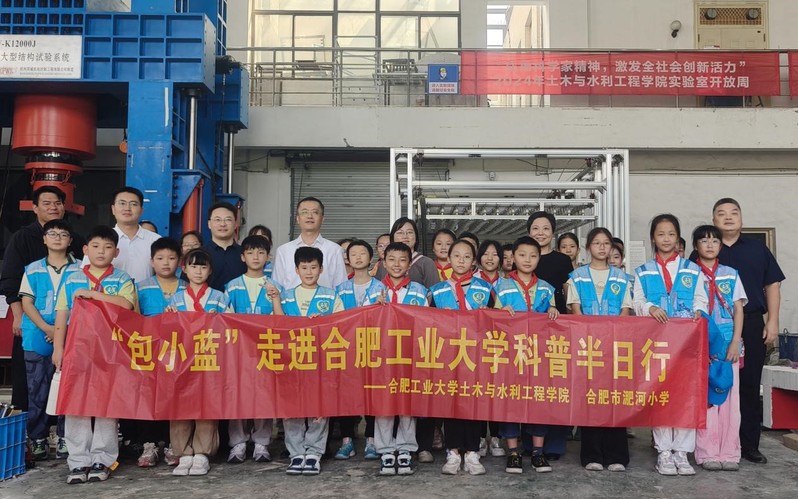 科普开放日期间还迎来了一批特别的“小客人”。9月25日,合肥市淝河小学30余名“包小蓝”同学走进了本次实验中心科普开放日。在结构实验室,黄亮、赵春风老师为小学生们先后讲解了“环境耦合大型科学实验装置”,演示了“U型钢包覆混凝土组合梁的抗弯性能实验”。从中,小同学们第一次真切地感知结构振动、地震及抗震的基本知识。在水力(利)学实验室小学生们参观了学院大型三级水利枢纽模型,赵静老师对小同学们做了深入浅出的细致介绍,小同学们积极参与到活动中,对水利工程及其利用不时提问。杨慎林老师还为小学生们做了“火是生命之光还是恐怖恶魔?”的科普讲座,讲座以生动有趣的实验为小同学们进行了火灾科普。通过科普参观,小同学们近距离接触到了的土木水利与建筑环境的科学知识,点燃了学生们对科学探索的热情。