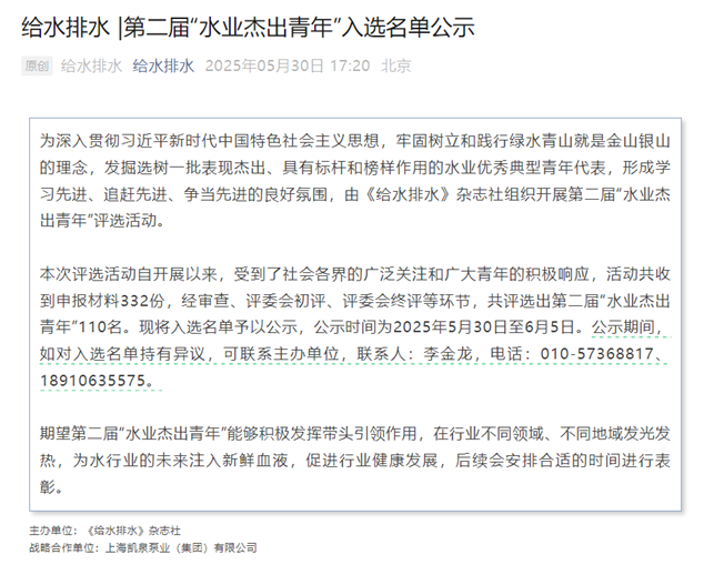 《给水排水》第二届“水业杰出青年“入选名单公示:https://mp.weixin.qq.com/s/KCZD5u_6HfyKqhTLfSq5hg
