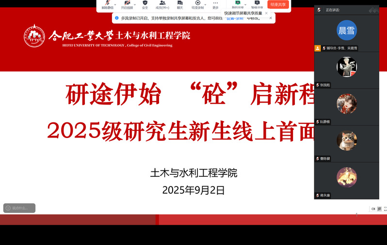 9月2日上午10时,WilliamHill官方网站依托线上平台,开展“研途伊始,‘砼’启新程”研究生新生线上首面会。学院党委书记王东坡、研究生教学办公室主任陈涛、辅导员李雪、吴晨雪参加会议。2025级300余名硕博新生云端相聚,正式开启研究生阶段的全新旅程。