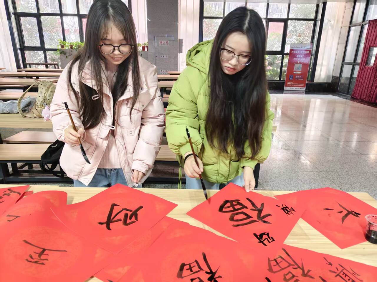 活动通过“包饺子、剪窗花、写‘福’字、品饺子”四个环节,引导学子们在亲身实践与协作共创中沉浸式体验传统节俗。活动伊始,食堂工作人员首先进行包饺子技法示范,从填馅到捏合成型,逐步讲解操作要领。随后同学们动手实践,借助准备好的猪肉白菜和韭菜鸡蛋馅料,在协作交流中完成形态各样的饺子制作。在剪窗花和书写“福”字环节中,同学们运用剪纸的基本技法,将红色纸张转化为蕴含吉祥寓意的窗花图案,于红纸之上凝神运笔,在一划一捺间用笔墨承载祝福、寄托祝愿。随后,同学们围坐桌边品尝亲手包的饺子,鲜香在舌尖绽放,劳动的甘美与文化的温度在热气中交融升腾。