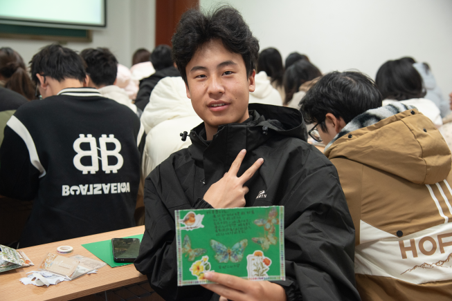 活动现场洋溢着热烈而专注的氛围。同学们手持彩笔与卡纸,倾心创作:有人以细腻笔触描绘生动插画,将祝福蕴于斑斓色彩之中;有人伏案书写诗句,以凝练文字编织温暖梦境;还有人真诚分享成长感悟,以亲身经历传递前行力量。一张张贺卡虽篇幅有限,却承载着学子们深厚的善意与牵挂。每件作品皆为独特的心灵艺术品,字里行间凝结着真诚的关怀与期许。