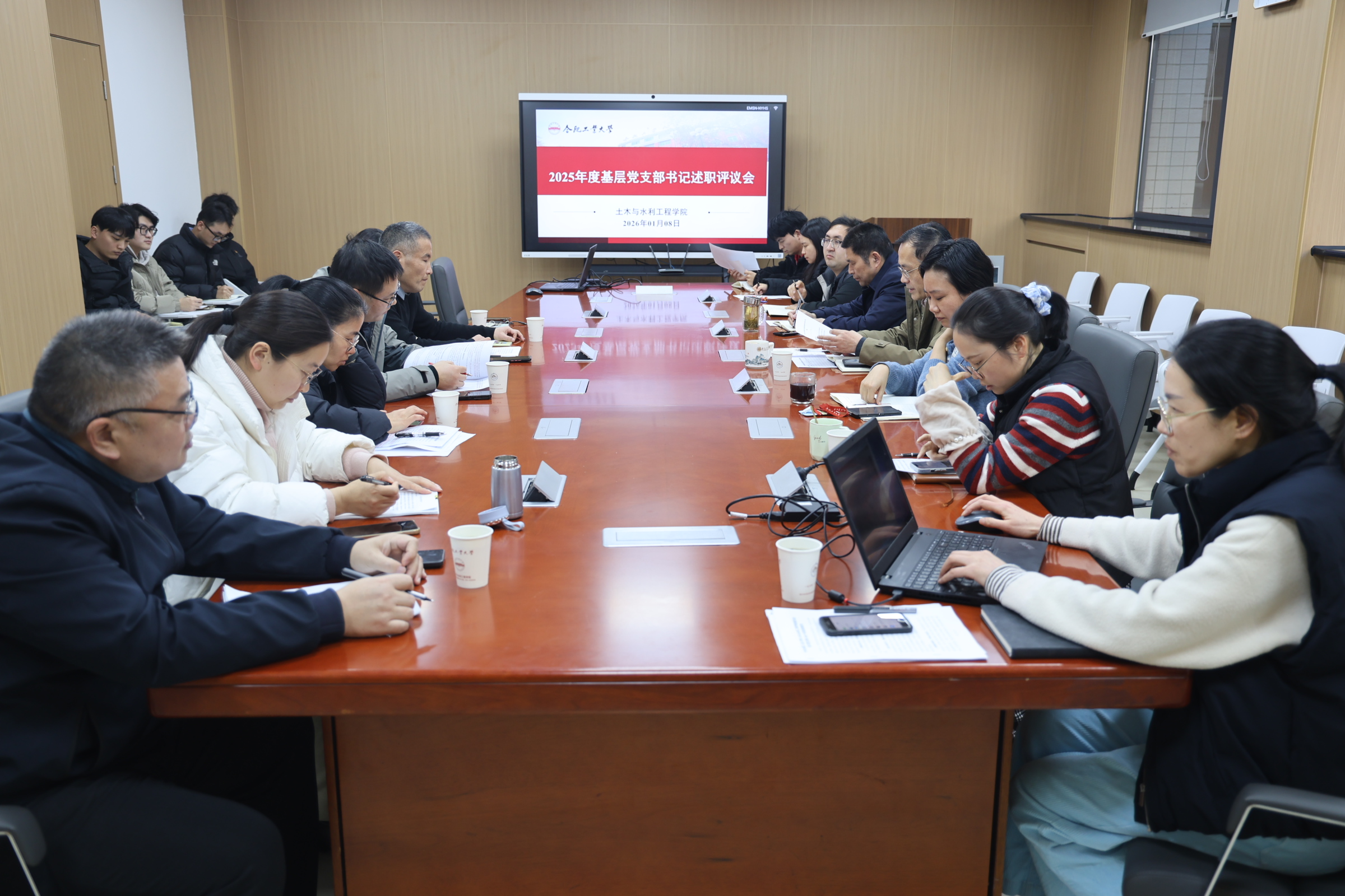 为深入贯彻新时代党的建设总要求,1月8日下午,学院在纬地楼414会议室召开2025年度基层党支部书记述职评议会。学院教工党支部、学生党支部书记依次围绕支部基本情况、年度工作开展成效、存在问题及未来规划等方面开展述职。学院党委书记王东坡、正处级组织员李强、党委副书记关茜及各基层党支部书记参加会议。
